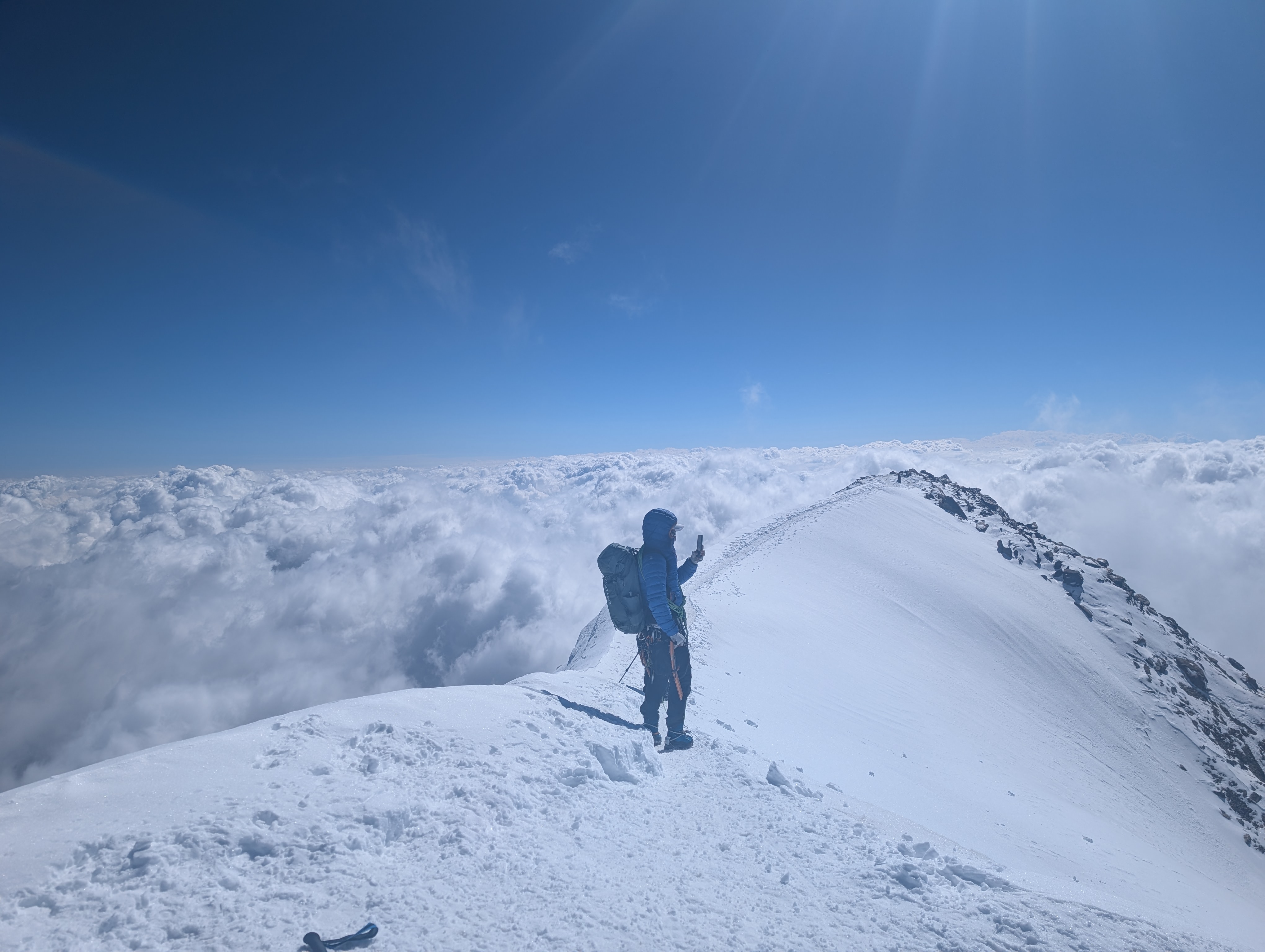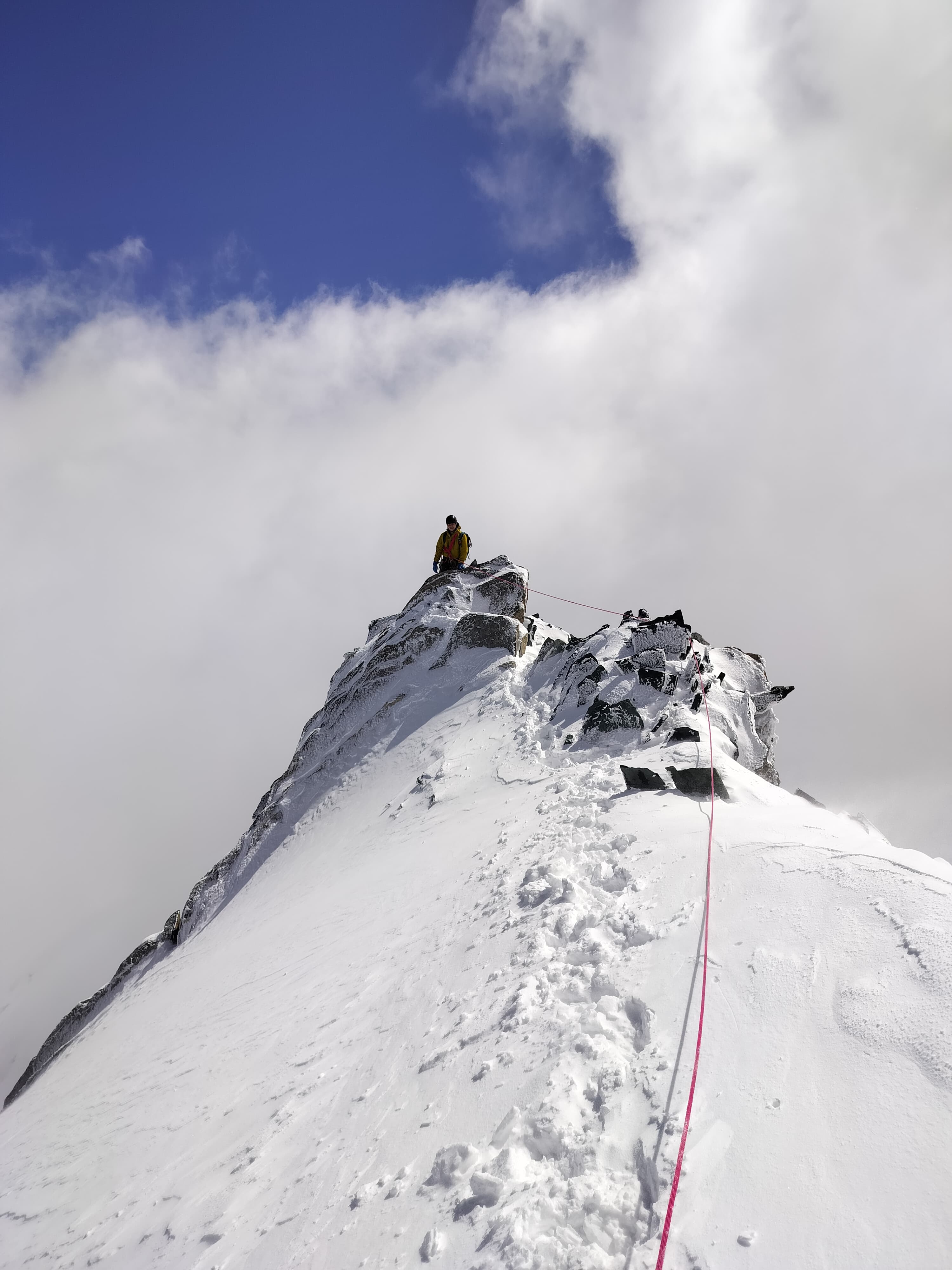 Once we climbed out of the cloud and onto the ridge we had a section of good snow plodding and then a short climb to the summit. The climbing has been overly protected by steel chains, but its still good fun.