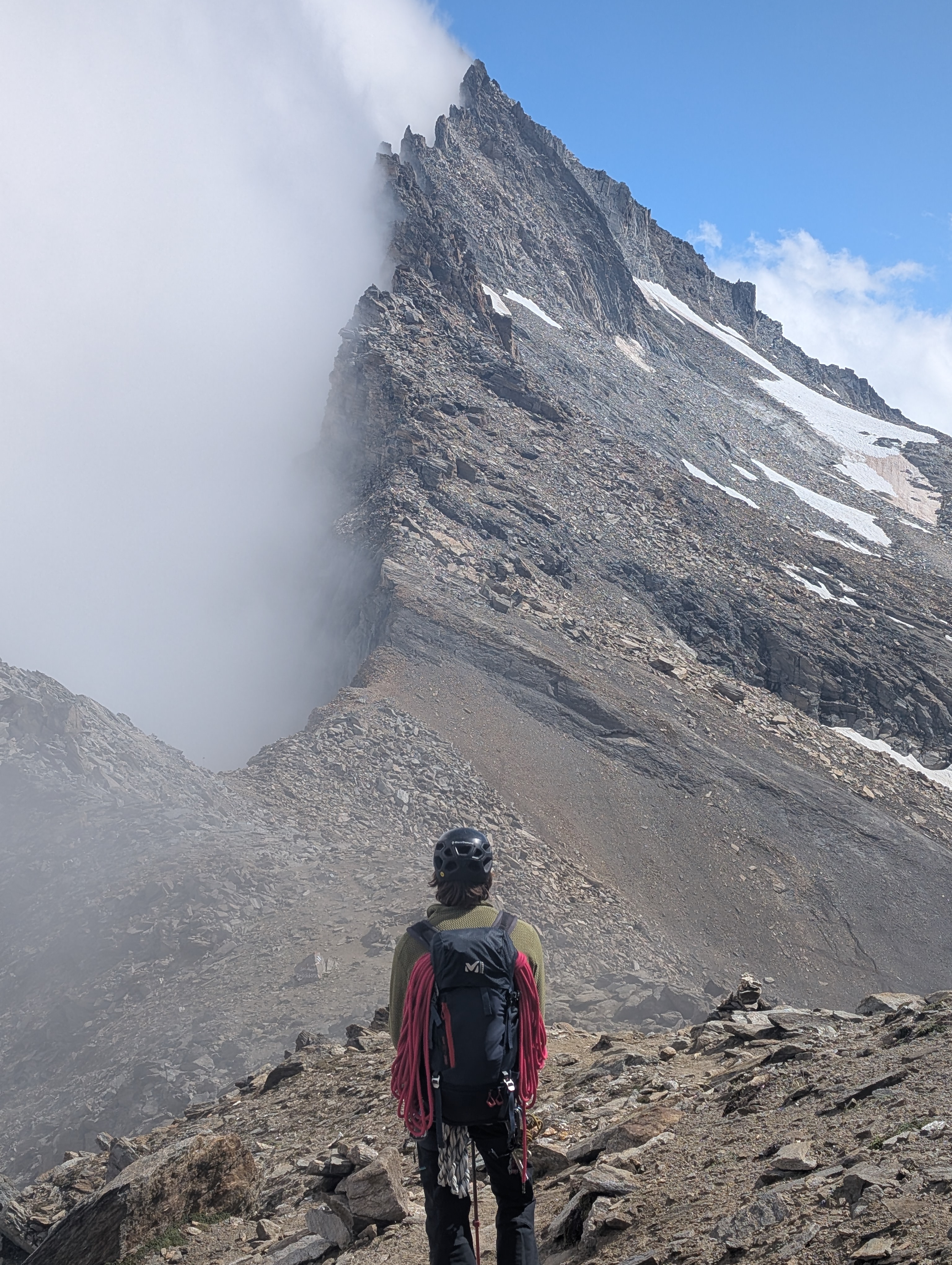 The descent down the SE ridge is extremely chossy on top, and not easy to navigate. You eventually get to a beautiful coll, and from there it is a pleasant walk to the Almageller hut, or a brutal 5 hour slog to Saas Almagel. We opted for the former so that we could try the Dri Horlini the next day.