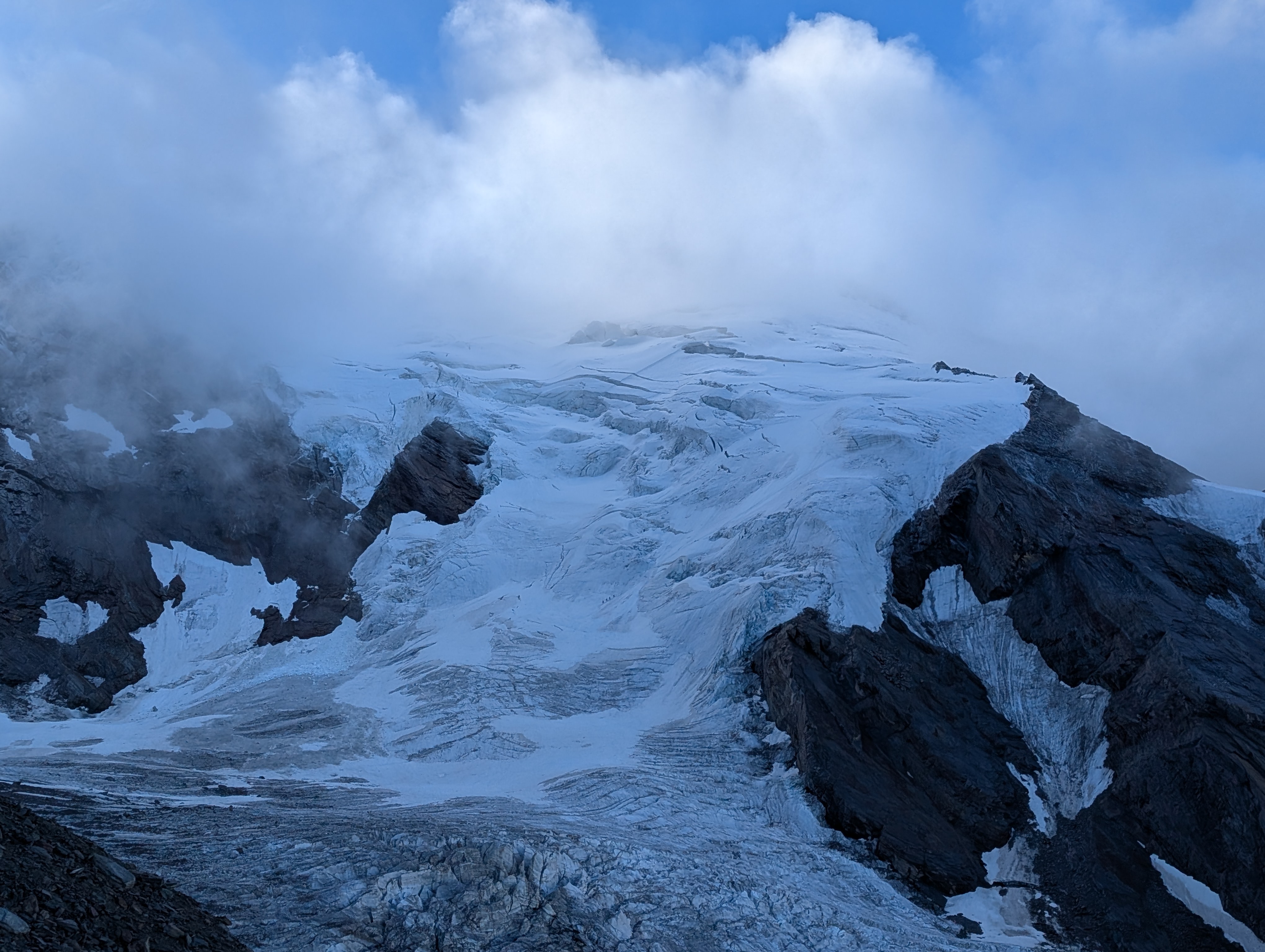 Katharine, Nathan and I did Weissmies as a three. The first section glacier was busy and I found the main steep icy slope to be quite scary, but once you are above that it is a long but pleasant snow plod to the top.